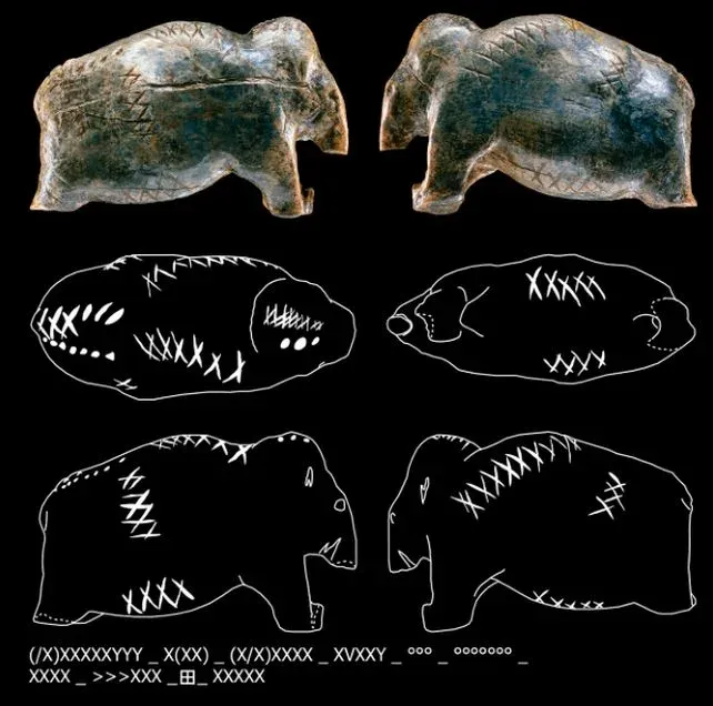 รูปนี้เป็นรูปช้างแมมมอธสมัยออริเนเซียนซึ่งแกะสลักมาจากงา และรอบ ๆ เต็มไปด้วยร่องรอยของการขีดเขียน ซึ่งจากการวิเคราะห์โดยละเอียดพบว่า รอยแกะสลักปริศนาบนสิ่งประดิษฐ์ยุคหินเก่าดังกล่าวนั้น บ่งบอกว่ามนุษย์ยุคใหม่ตอนต้นใช้สัญลักษณ์ที่มีโครงสร้างในการสื่อสารมาตั้งแต่เมื่อ 40,000 ปีที่แล้ว