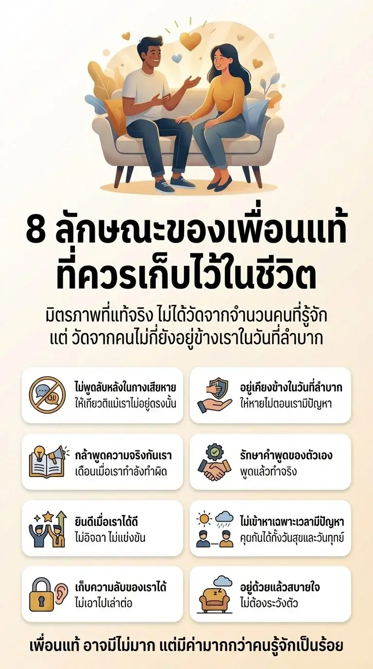 เพราะเพื่อนแท้เพียงไม่กี่คน มีค่ามากกว่าคนรู้จักเป็นร้อย ในวันที่ชีวิตเงียบเหงา หรือวันที่เราต้องเผชิญปัญหาหนัก ๆ คนเหล่านี้นี่เองที่จะยังนั่งอยู่ข้างเรา ไม่ได้หายไปตามกาลเวลา
