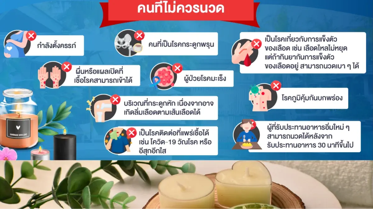 - ผู้ที่รับประทานอาหารอิ่มใหม่ ๆ สามารถนวดได้หลังจากรับประทานอาหาร 30 นาทีขึ้นไป