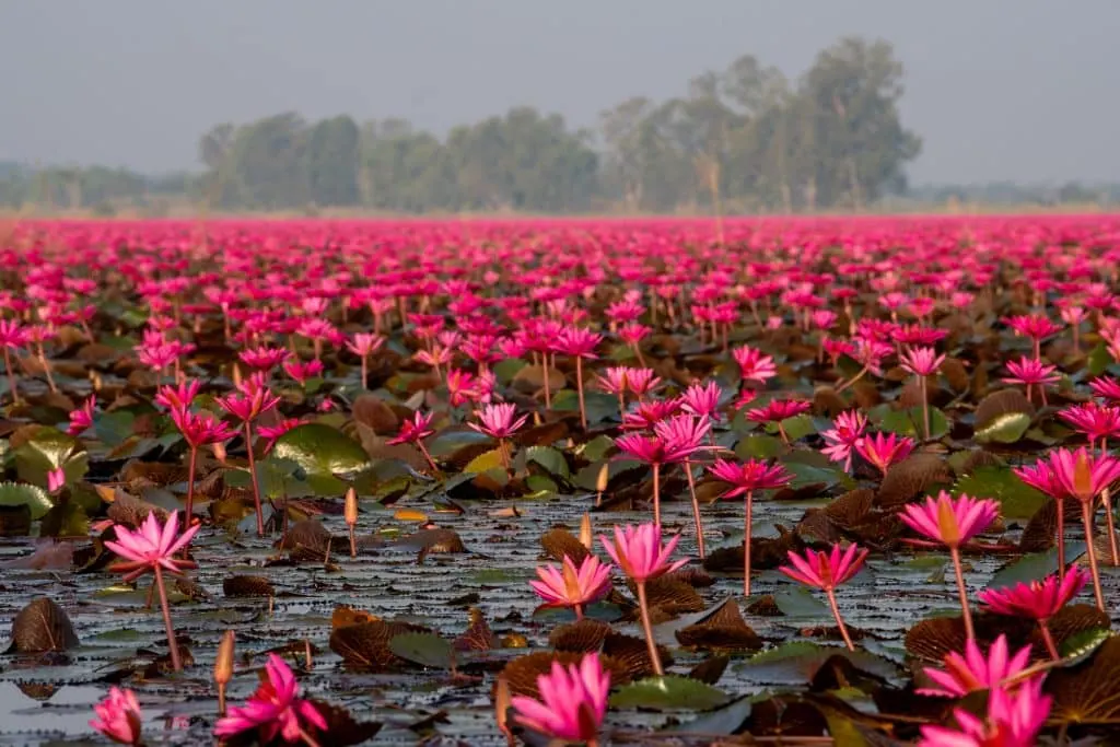 ในช่วงเช้าตรู่ ดอกบัวแดงนับล้านดอกจะบานเต็มท้องน้ำ จนมองไกล ๆ เหมือนทะเลสีชมพูขนาดมหึมา