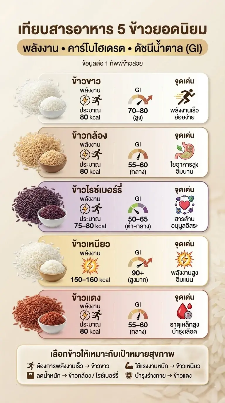 หมายเหตุ: ข้อมูลต่อ 1 ทัพพีข้าวสวย (ประมาณ 60–80 กรัม เมื่อหุงสุก)