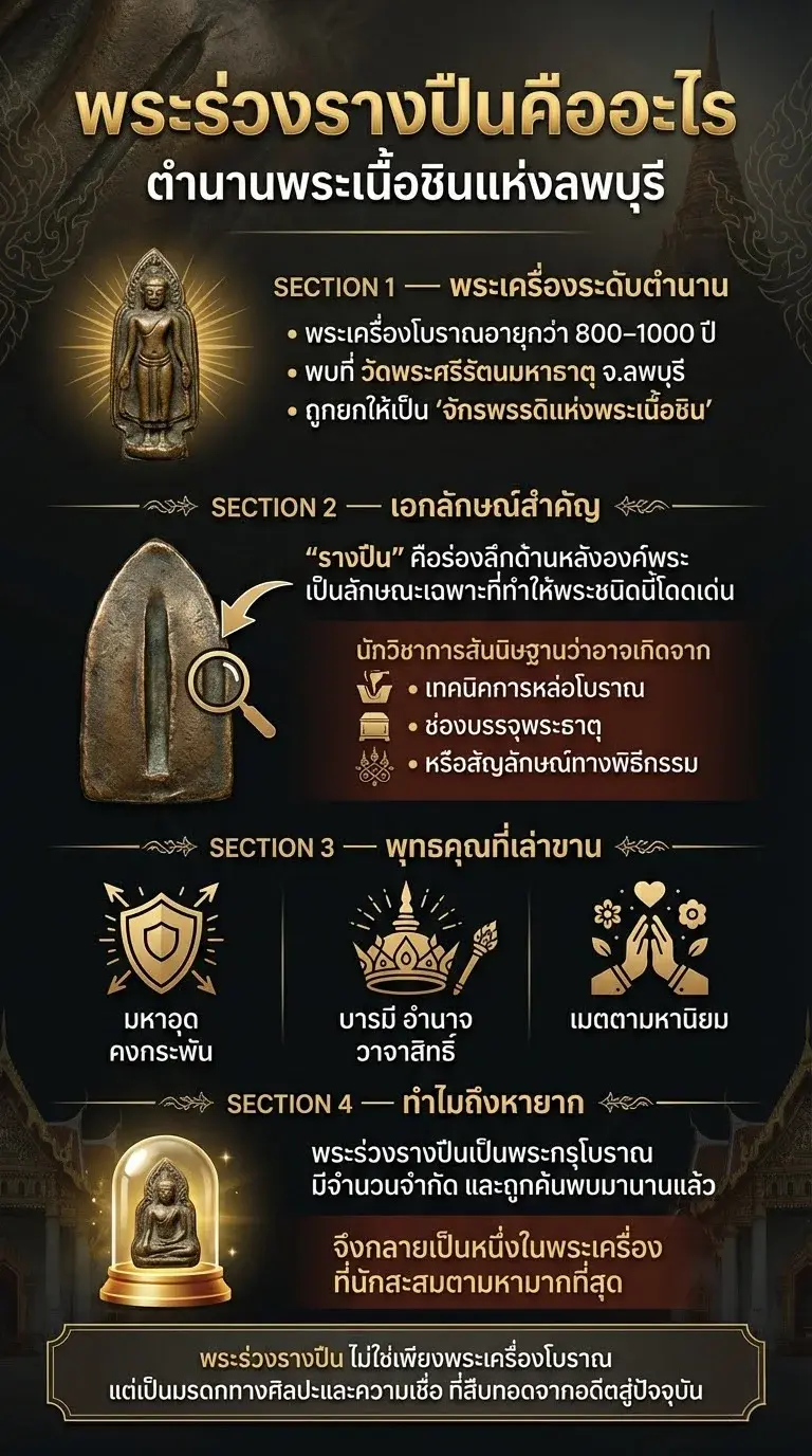 สิ่งที่ทำให้พระเครื่ององค์นี้โดดเด่น ไม่ได้มีเพียงความเก่าแก่เกือบพันปี แต่ยังรวมถึง เอกลักษณ์ด้านหลังองค์พระที่มีร่องลึกยาวตลอดแนว จนกลายเป็นที่มาของชื่อ “รางปืน” และเป็นหนึ่งในปริศนาที่ทำให้นักสะสมสนใจมาจนถึงทุกวันนี้