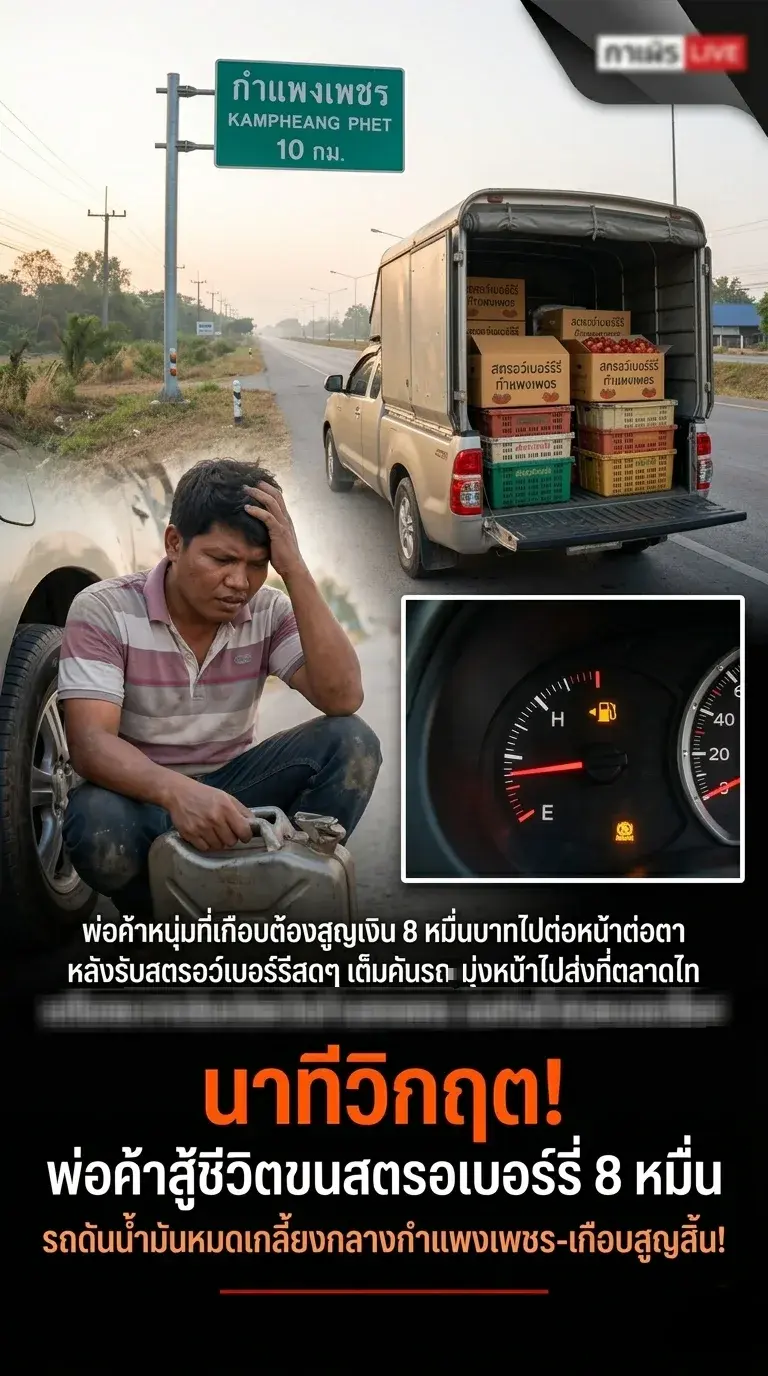 นาทีนี้ต้องแชร์! เปิดนาทีชีวิตของพ่อค้าหนุ่มที่เกือบต้องสูญเงิน 8 หมื่นบาทไปต่อหน้าต่อตา หลังรับสตรอว์เบอร์รีสดๆ เต็มคันรถมุ่งหน้าไปส่งที่ตลาดไท แต่โชคชะตากลับเล่นตลก เมื่อถึงช่วงจังหวัดกำแพงเพชร รถเกิดน้ำมันหมดเกลี้ยง!