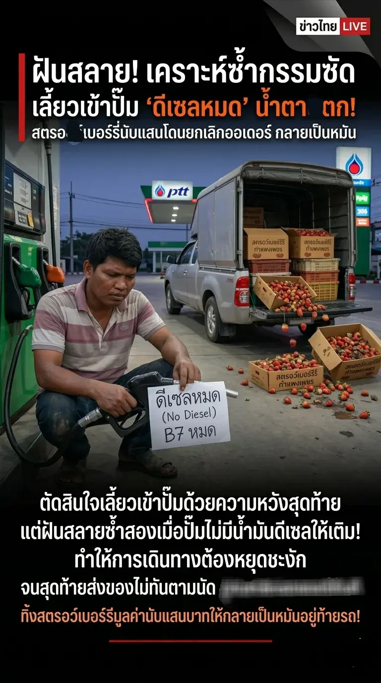 ตัดสินใจเลี้ยวเข้าปั๊มด้วยความหวังสุดท้าย แต่ฝันสลายซ้ำสองเมื่อปั๊มไม่มีน้ำมันดีเซลให้เติม! ทำให้การเดินทางต้องหยุดชะงัก จนสุดท้ายส่งของไม่ทันตามนัด ถูกปลายทางยกเลิกออเดอร์ทันที ทิ้งสตรอว์เบอร์รีมูลค่านับแสนบาทให้กลายเป็นหมันอยู่ท้ายรถ!