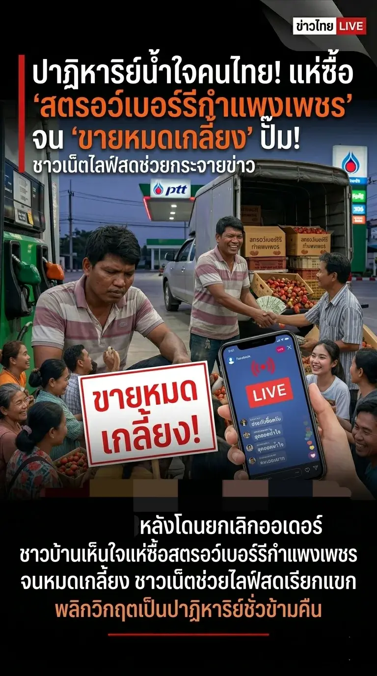 พลังโซเชียลและน้ำใจคนไทยไม่เคยแพ้ใคร! เพียงไม่นานคนในพื้นที่แห่กันมาอุดหนุนจนเนืองแน่นปั๊ม ล่าสุดสตรอว์เบอร์รีทั้งหมด "ขายหมดเกลี้ยง" พลิกจากน้ำตาความเศร้าให้กลายเป็นรอยยิ้มแห่งความตื้นตันใจ