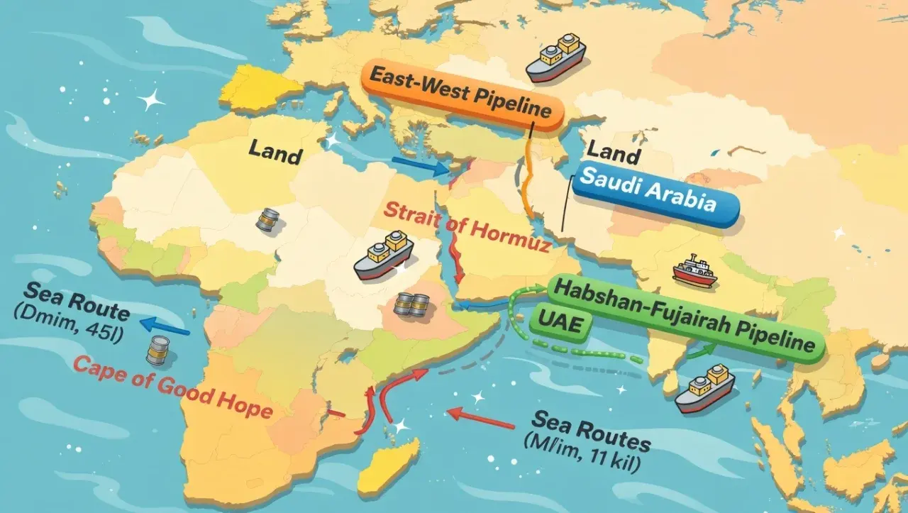 เส้นทางเลี่ยงช่องแคบฮอร์มุซ (Strait of Hormuz) โดยเฉพาะช่วงที่มีความตึงเครียดในภูมิภาค เพราะช่องแคบนี้เป็นจุดคอขวดสำคัญที่สุดของโลกในการขนส่งน้ำมันและก๊าซธรรมชาติเหลว (LNG) ประมาณ 20% ของน้ำมันที่ใช้กันทั้งโลกต้องผ่านตรงนี้ทุกวัน ถ้าช่องแคบถูกปิดหรือถูกคุกคามหนักจริง ๆ การหาเส้นทางเลี่ยงจึงกลายเป็นเรื่องเร่งด่วนมาก