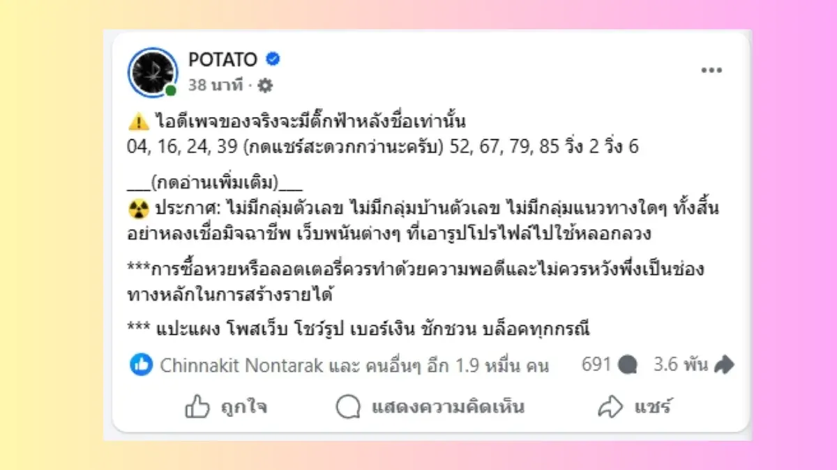กระแสความตื่นเต้นในวันออกสลากกินแบ่งรัฐบาลมักมาพร้อมกับที่มาของตัวเลขที่หลากหลาย แต่ที่สร้างความฮือฮาได้เสมอคือ "เลขเด็ด" จากเพจศิลปินดังอย่างวง POTATO ที่กลายเป็นสีสันและจุดนัดพบของแฟนเพลงที่รักการเสี่ยงโชค โดยทางเพจได้ออกมาให้แนวทางพร้อมย้ำเตือนสติแฟนคลับอย่างชัดเจน