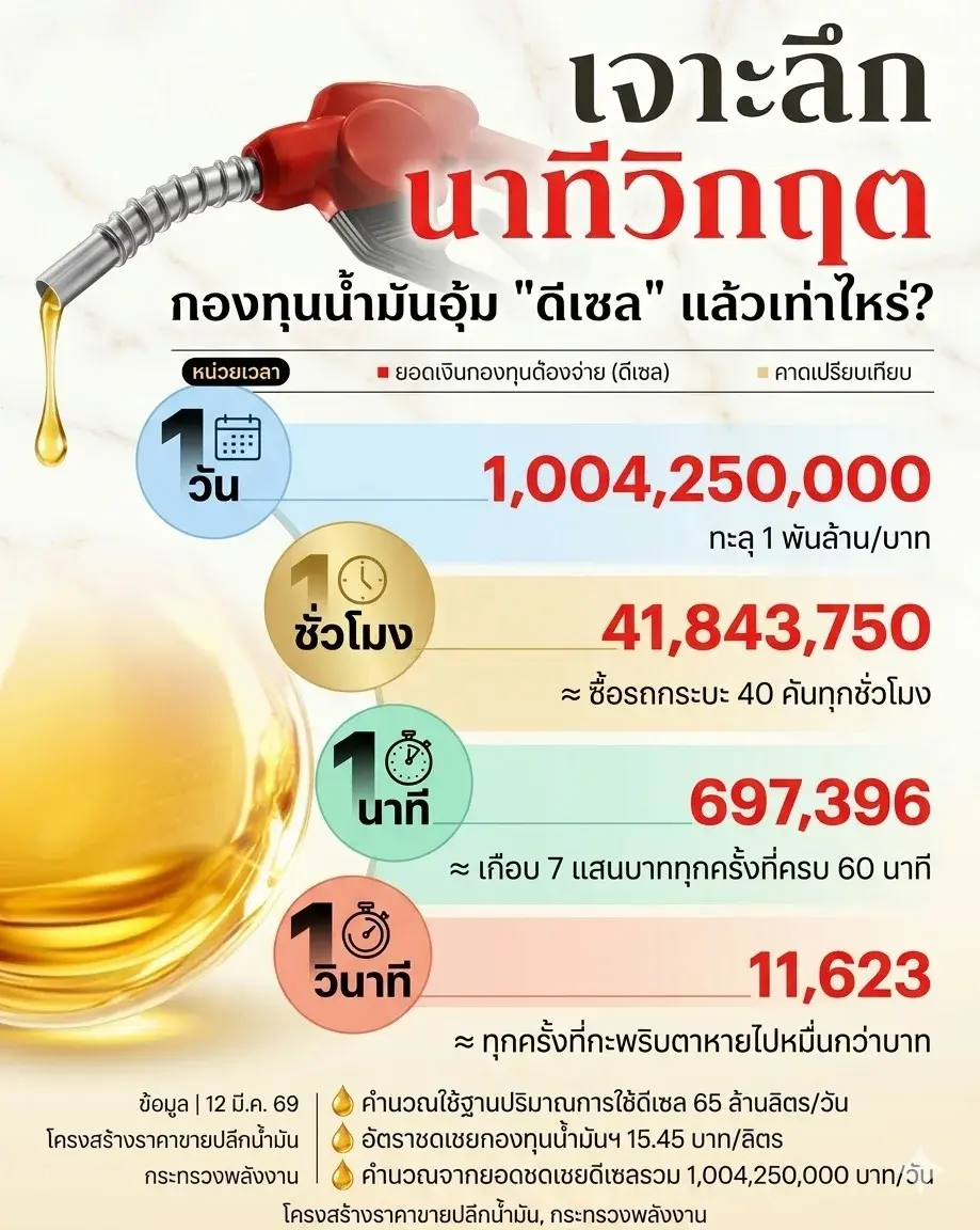 -ปัจจุบัน (มีนาคม 2569) กองทุนน้ำมันฯ แบกรับภาระอุดหนุนอยู่มหาศาล (บางช่วงสูงถึง 11-16 บาทต่อลิตร)