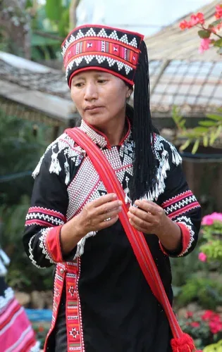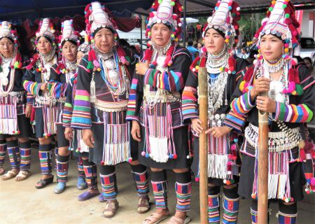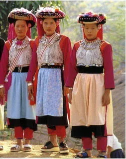 อาข่า เป็นชนเผ่าที่มีชื่อเสียงเรื่องเครื่องแต่งกายประดับเงินและหมวกทรงสูง