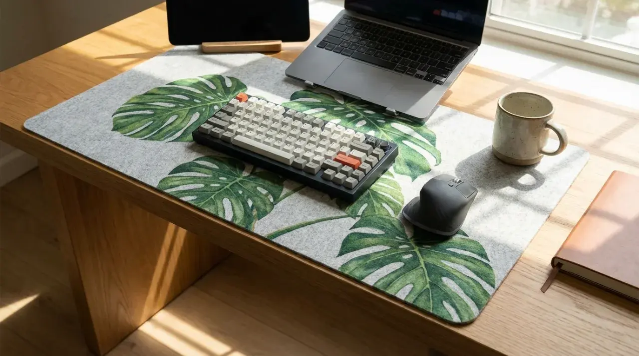 ไอเทมแรกที่ต้องมี! แผ่นรองเม้าส์หนังหรือผ้าขนาดใหญ่จะช่วยคุมโทนสีของโต๊ะให้ไปในทิศทางเดียวกัน และช่วยให้การเลื่อนเม้าส์ลื่นไหล ไม่ต้องกลัวโต๊ะเป็นรอยครับ