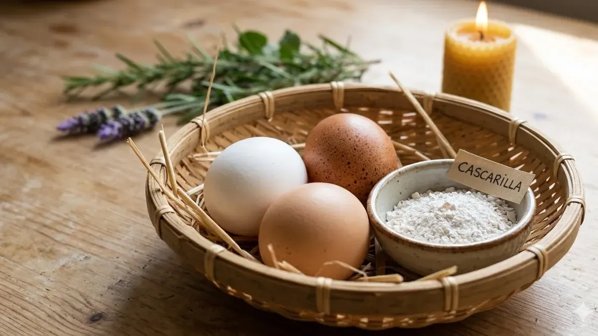 ผงคาสคาริลลา (Cascarilla) ขีดเขียนวงเวท: นำเปลือกไข่ไก่สีขาวมาล้างให้สะอาด ตากแห้งแล้วบดให้เป็นผงละเอียด ผงนี้คืออุปกรณ์ป้องกันชั้นยอดที่ใช้สำหรับโรยรอบบ้านเพื่อสร้างวงเวทป้องกันสิ่งชั่วร้าย หรือใช้ตกแต่งเทียนอาคมเพื่อเสริมพลัง