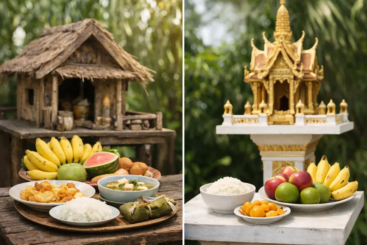 ต่างจากศาลพระภูมิ ที่คนไทยเชื่อว่าเป็นที่สถิตของเทพารักษ์ ผู้ดูแลผืนดิน ดูแลบ้านให้ร่มเย็นเป็นสุข ท่านไม่ได้ถูกมองว่าเป็นมนุษย์ที่เคยใช้ชีวิตแบบเรา แต่เป็นสิ่งศักดิ์สิทธิ์ที่อยู่สูงขึ้นไปอีกระดับหนึ่ง การถวายของจึงไม่เน้นความหลากหลาย แต่เน้นความเรียบร้อย สะอาด และมีแบบแผน ข้าวหนึ่งถ้วย ขนมหนึ่งอย่าง จะเป็นขนมไทยหรือขนมที่ดูสุภาพเรียบร้อยในปัจจุบันก็ได้ และถ้ามีผลไม้เพิ่มก็ถือว่าเป็นสิริมงคล