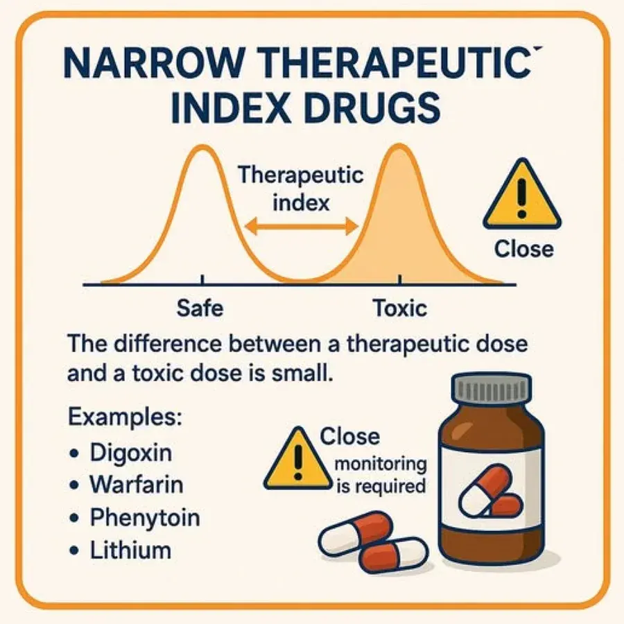 ทำไมถึงอันตราย: ระดับยาที่ใช้รักษาและระดับที่เป็นพิษอยู่ใกล้กันมาก เช่น Digoxin (ยารักษาโรคหัวใจ) หรือ Warfarin (ยาละลายลิ่มเลือด) หากได้รับเกินขนาดเพียงเล็กน้อยอาจทำให้หัวใจหยุดเต้นหรือเลือดออกไม่หยุดจนเสียชีวิตได้