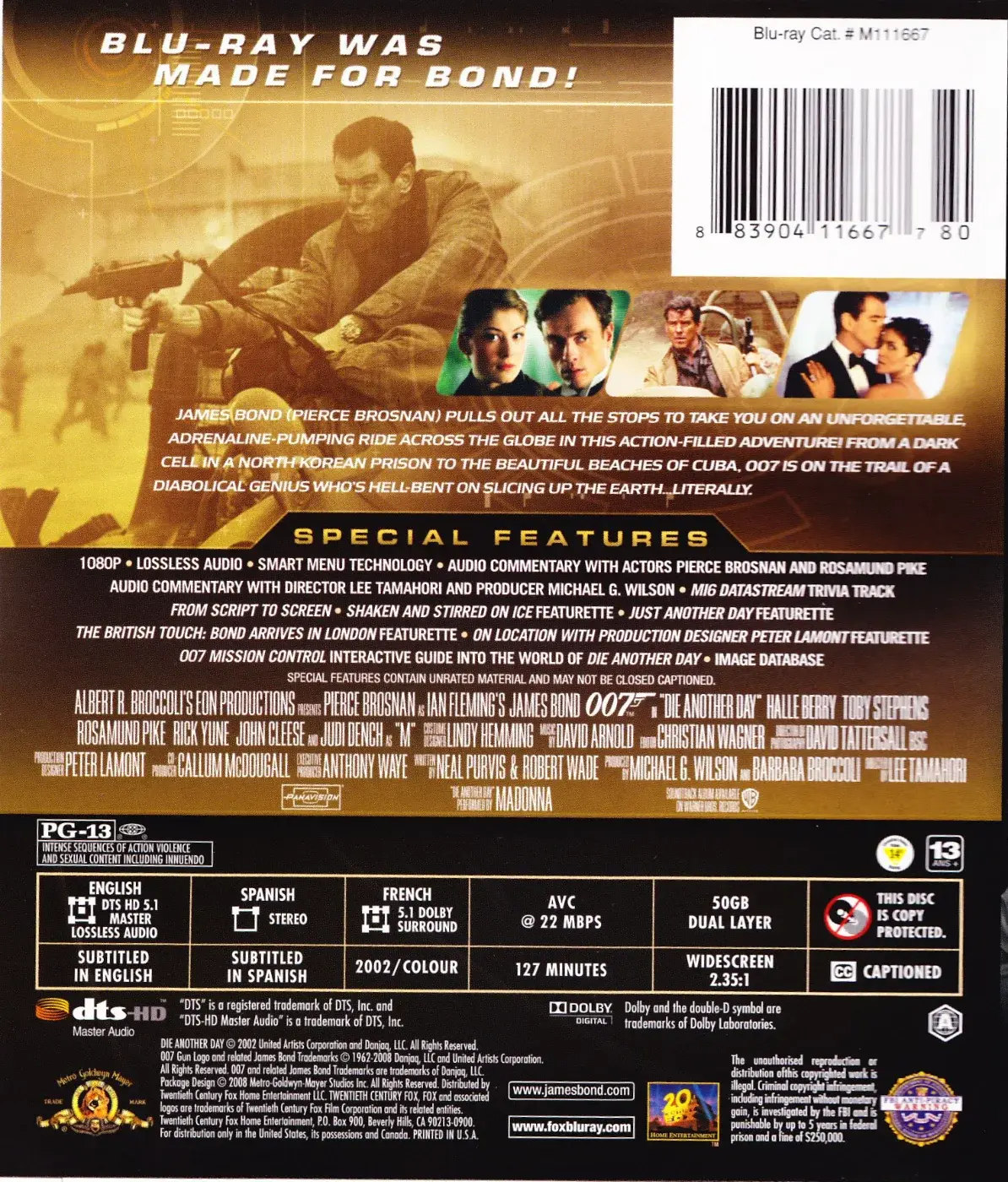 รหัสสังหารสายลับ 007 ครั้งสุดท้ายของ Pierce Brosnan กับฉาก Action ในสเกลอลังการใหญ่กว่าทุกครั้งที่ผ่านมา เรื่องราวของทหารเกาหลีเหนือที่ให้การสนับสนุนผู้ก่อการร้ายในแถบตะวันตกเพื่อพัฒนาอาวุธจากสถานีอวกาศสุดอันตรายและไฮเทคกว่าที่เคย ผลงานการกำกับโดย Lee Tamahori