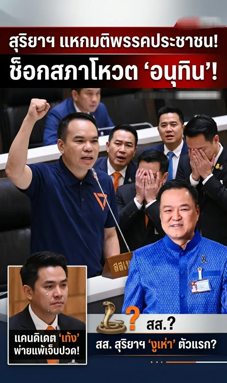 "สุริยา วงศ์อารีย์" สส.อุดรธานี เขต 7 จากพรรคประชาชน ทำเอาเพื่อนร่วมพรรคช็อกเหวอกันทั้งบาง! เมื่อเจ้าตัวลุกขึ้นขานชื่อเทเสียงโหวตดัน "อนุทิน ชาญวีรกูล" ขึ้นนั่งแท่นนายกรัฐมนตรีแบบหน้าตาเฉย! ทิ้งแคนดิเดตพรรคตัวเองอย่าง "เท้ง ณัฐพงษ์" ให้พ่ายแพ้ไปอย่างสุดเจ็บปวด!
