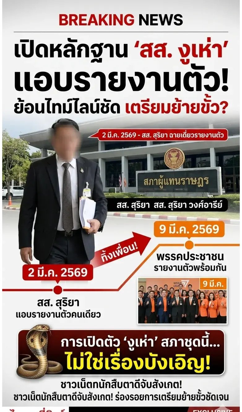 ชาวเน็ตนักสืบตาดีจับสังเกตได้ว่า ถ้าย้อนไทม์ไลน์กลับไป จะเห็นร่องรอยของการ "เตรียมย้ายขั้ว" ชัดเจนมาก! เพราะ สส.คนนี้ คือคนเดียวที่ฉายเดี่ยวไปรายงานตัวที่สภาตั้งแต่ 2 มี.ค. ทั้งที่พรรคมีมติให้กอดคอไปพร้อมกันในวันที่ 9 มี.ค.