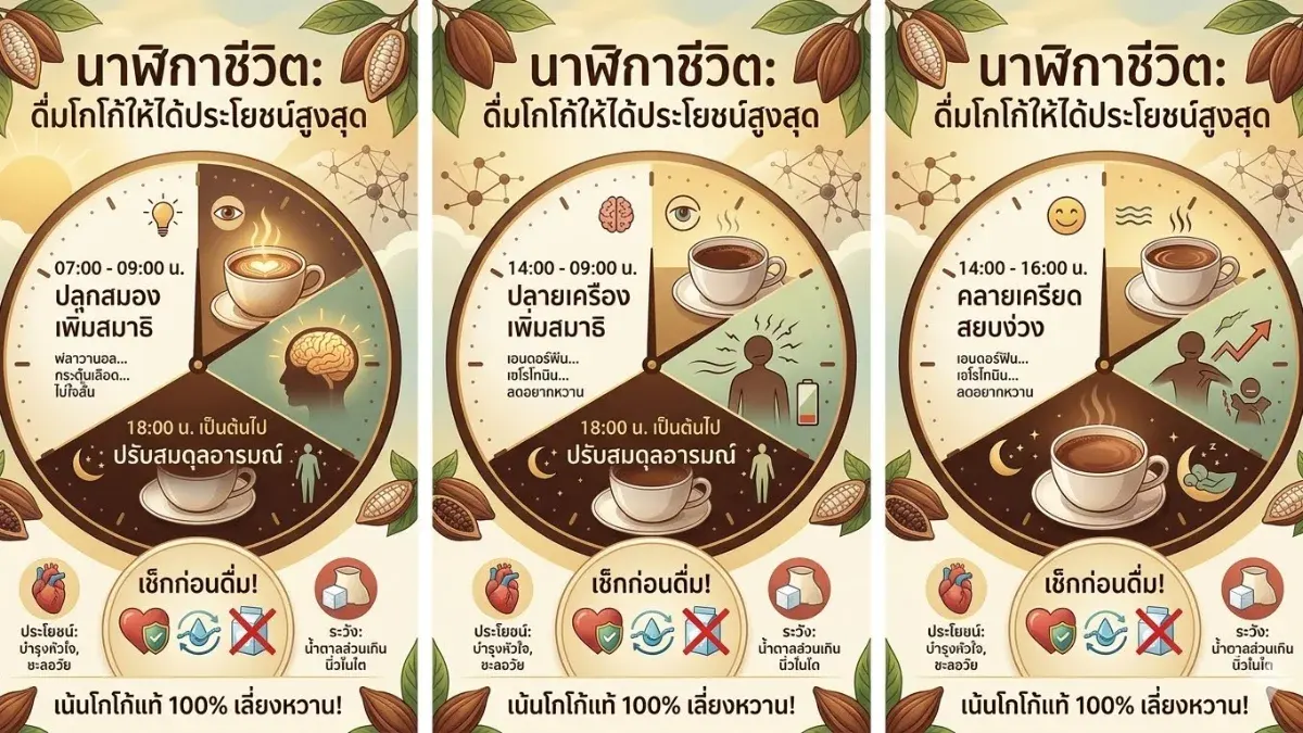 หัวใจสำคัญของการดื่มโกโก้ให้ได้ประโยชน์สูงสุดคือ "การดื่มให้ถูกเวลาและเลือกวัตถุดิบที่บริสุทธิ์" หากเน้นโกโก้แท้เลี่ยงการเติมหวาน และดื่มตามช่วงเวลาที่ร่างกายต้องการตามนาฬิกาชีวิต เครื่องดื่มแก้วนี้จะเป็นมากกว่าแค่ของอร่อย แต่จะเป็นตัวช่วยบำรุงสุขภาพและสมองให้ฟิตปั๋งได้ในทุกวัน
