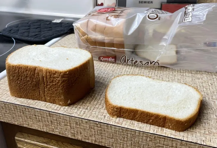 5. ขนมปังแถวของฉันหั่นไว้ไม่ดี ก็เลยมีแผ่นที่ชิ้นใหญ่ยักษ์อยู่ด้วย แต่บางทีเขาอาจจะลืมหันมันก็ได้