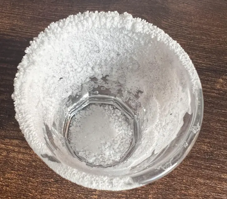 9. ฉันทิ้งน้ำเกลือไว้ในแก้ว และมันก็ก่อตัวเป็นเกล็ดคริสตัลรอบ ๆ ขอบแก้วเลยตอนที่น้ำมันระเหยไปหมด
