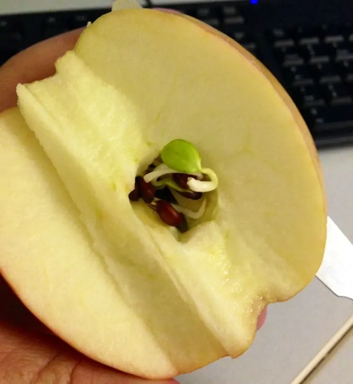 11. เมื่อเช้าฉันผ่าแอปเปิลเป็นครึ่งซีก และพบว่าเมล็ดข้างในเริ่มเจริญเติบโตเป็นต้นอ่อนแล้ว