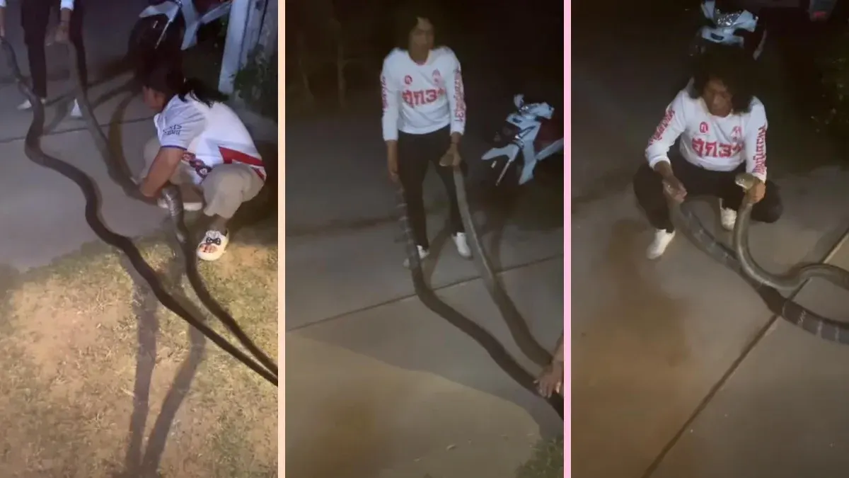 งูจงอางยักษ์บุกบ้าน เปิดศึกกลางลาน คนแห่ดูเลขที่บ้าน