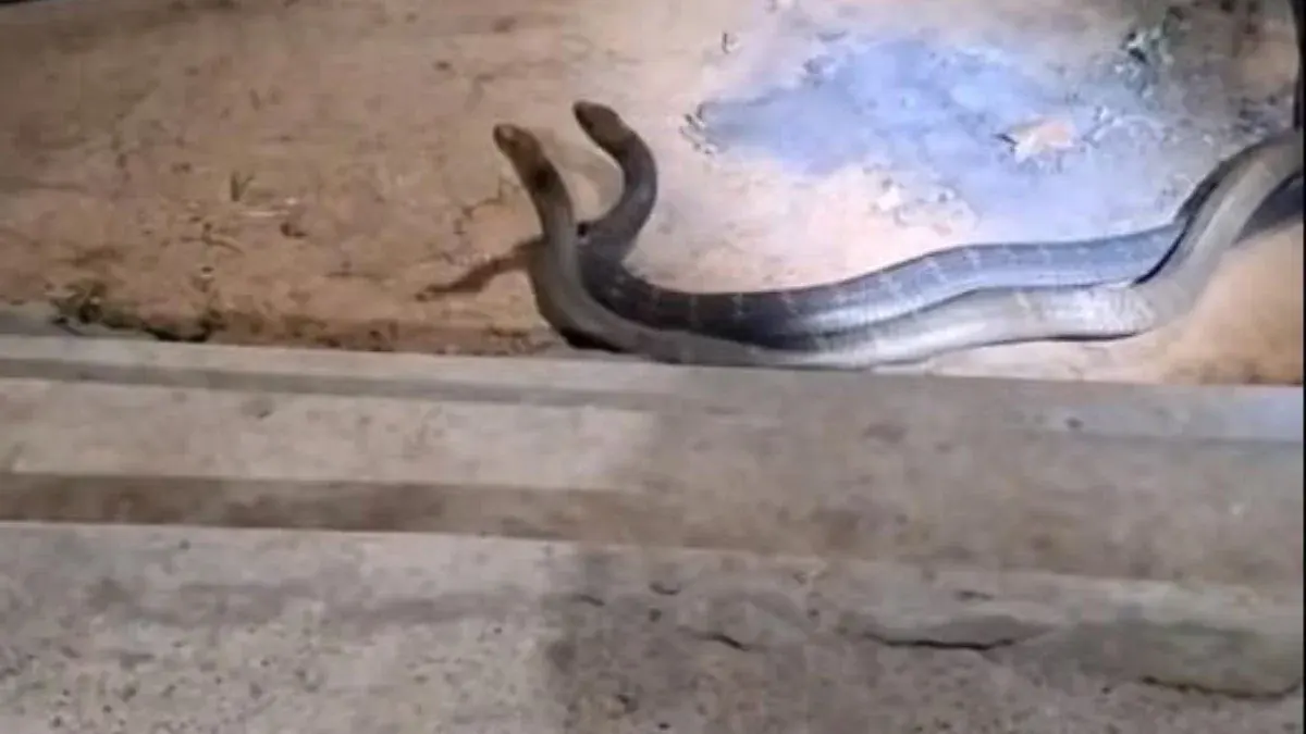 ระทึก! งูจงอางยักษ์ 2 ตัวพันเกลียวกลางลานดิน