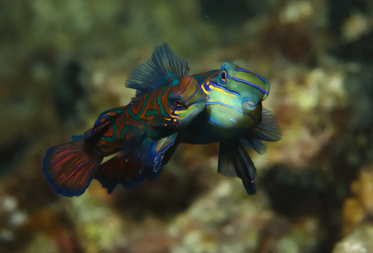 อีกช่วงเวลาหนึ่งที่ทำให้ปลาแมนดารินกลายเป็นดาวเด่นของโลกใต้น้ำ คือช่วงผสมพันธุ์ในยามพระอาทิตย์ตกดิน เมื่อแสงสุดท้ายของวันทอดตัวลงบนแนวปะการัง ตัวผู้จะเริ่มว่ายเข้าหาตัวเมียด้วยท่าทางเกี้ยวพาราสี จากนั้นทั้งคู่จะค่อย ๆ ลอยตัวขึ้นเหนือพื้นปะการังเคียงข้างกันอย่างแนบชิด ก่อนปล่อยไข่และสเปิร์มออกมาพร้อมกันในน้ำ เป็นภาพที่ทั้งอ่อนหวาน ละเมียดละไม และเกิดขึ้นเพียงช่วงสั้น ๆ จนกลายเป็นหนึ่งในพฤติกรรมธรรมชาติที่นักถ่ายภาพใต้น้ำทั่วโลกเฝ้ารอจะบันทึกภาพให้ได้สักครั้ง ความงดงามของช่วงเวลานี้ไม่ใช่เพียงความโรแมนติกในสายตามนุษย์ แต่ยังสะท้อนจังหวะชีวิตที่แนบแน่นกับสิ่งแวดล้อมและเวลาของธรรมชาติอย่างลึกซึ้ง