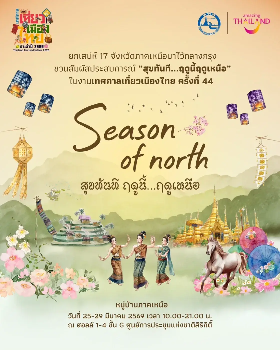 การท่องเที่ยวแห่งประเทศไทย ภูมิภาคภาคเหนือ สร้างปรากฏการณ์ครั้งใหญ่ เนรมิต “หมู่บ้านภาคเหนือ” ภายใต้แนวคิด “SEASON OF NORTH 2026: สุขทันที...ฤดูนี้ฤดูเหนือ” ภายในงานเทศกาลเที่ยวเมืองไทย ครั้งที่ 44 ระหว่างวันที่ 25 – 29 มีนาคม 2569 ณ ศูนย์การประชุมแห่งชาติสิริกิติ์ ยกภาคเหนือ ถ่ายทอดเสน่ห์ 17 จังหวัด มาไว้กลางกรุง ผ่านแนวคิด Contemporary Lanna ผสานวัฒนธรรมล้านนาเข้ากับความร่วมสมัยอย่างมีสไตล์ สร้างประสบการณ์ใหม่ที่ทั้ง “ว้าว สนุก และมีคุณค่า” ในพื้นที่เดียว