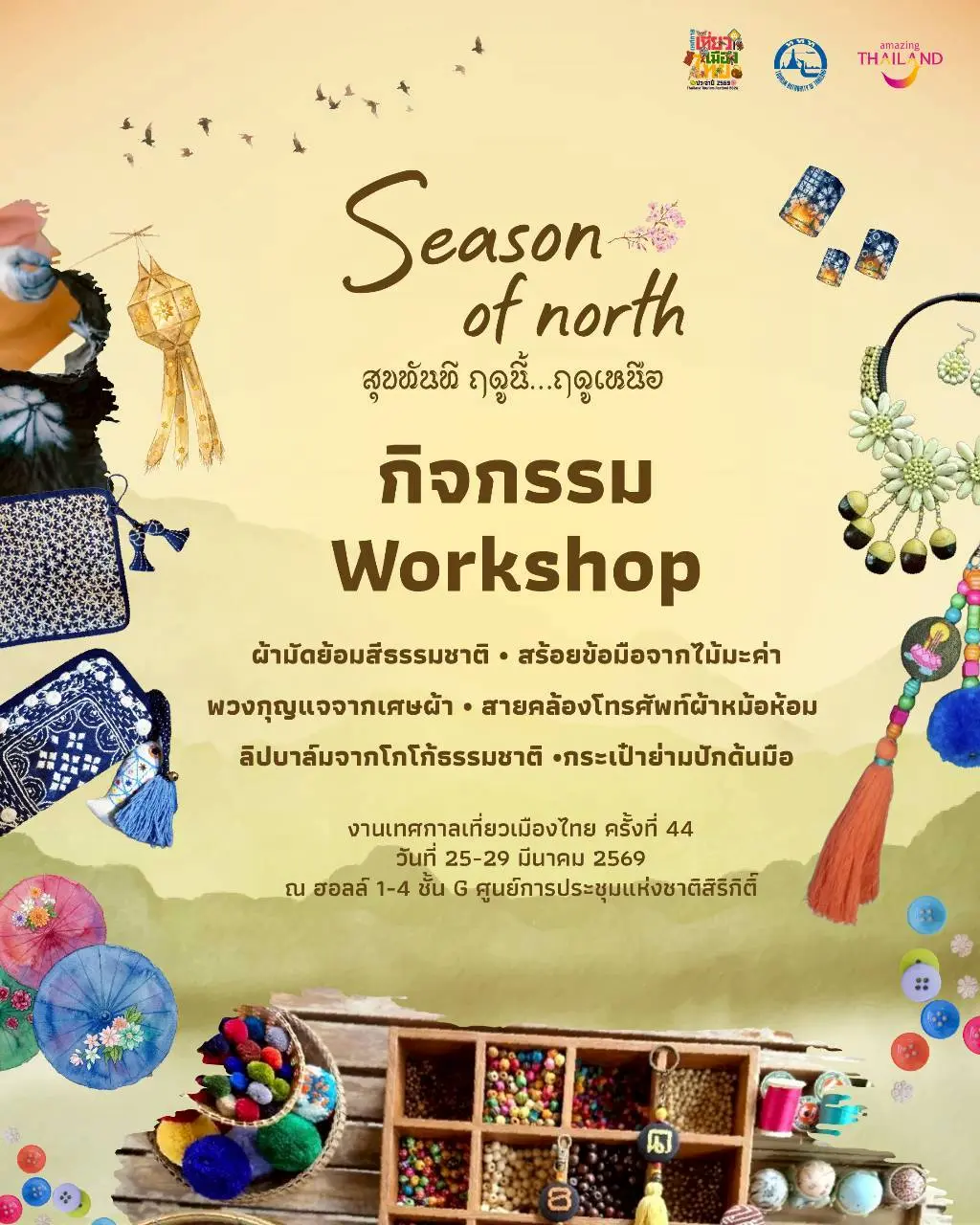 มาร่วมสัมผัสประสบการณ์ “สุขทันที…ฤดูนี้ฤดูเหนือ” ที่โซนหมู่บ้านภาคเหนือ ภายในงานเทศกาลเที่ยวเมืองไทย ครั้งที่ 44 ระหว่างวันที่ 25 – 29 มีนาคม 2569 เวลา 10.00 – 21.00 น. ณ ฮอลล์ 1 – 4 ชั้น G ศูนย์การประชุมแห่งชาติสิริกิติ์ กรุงเทพมหานคร