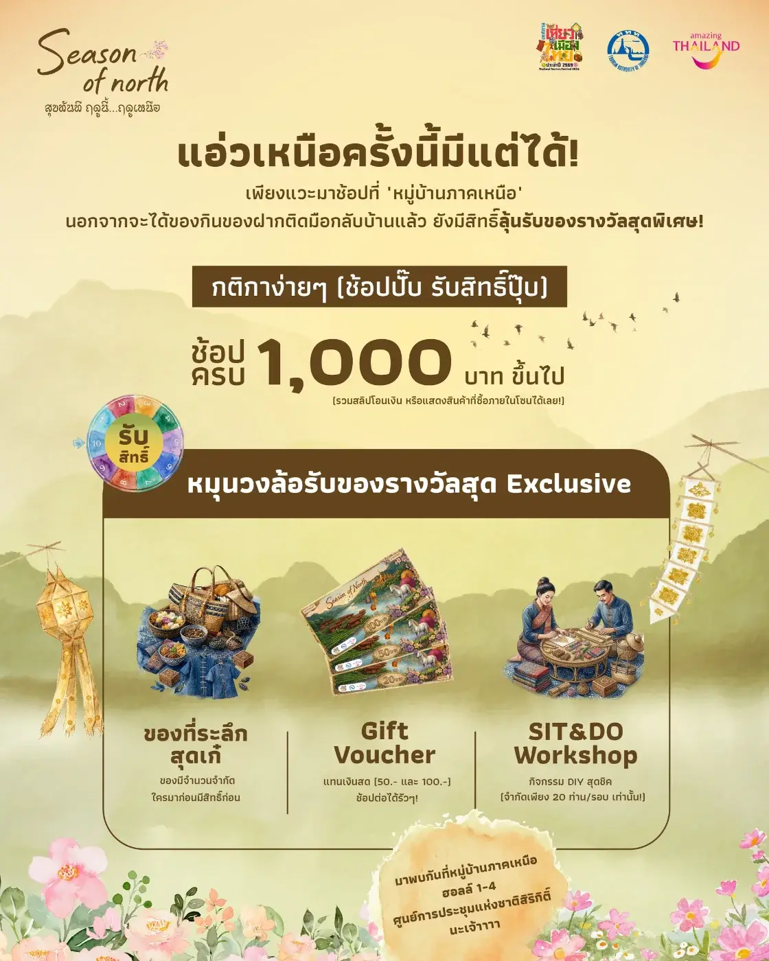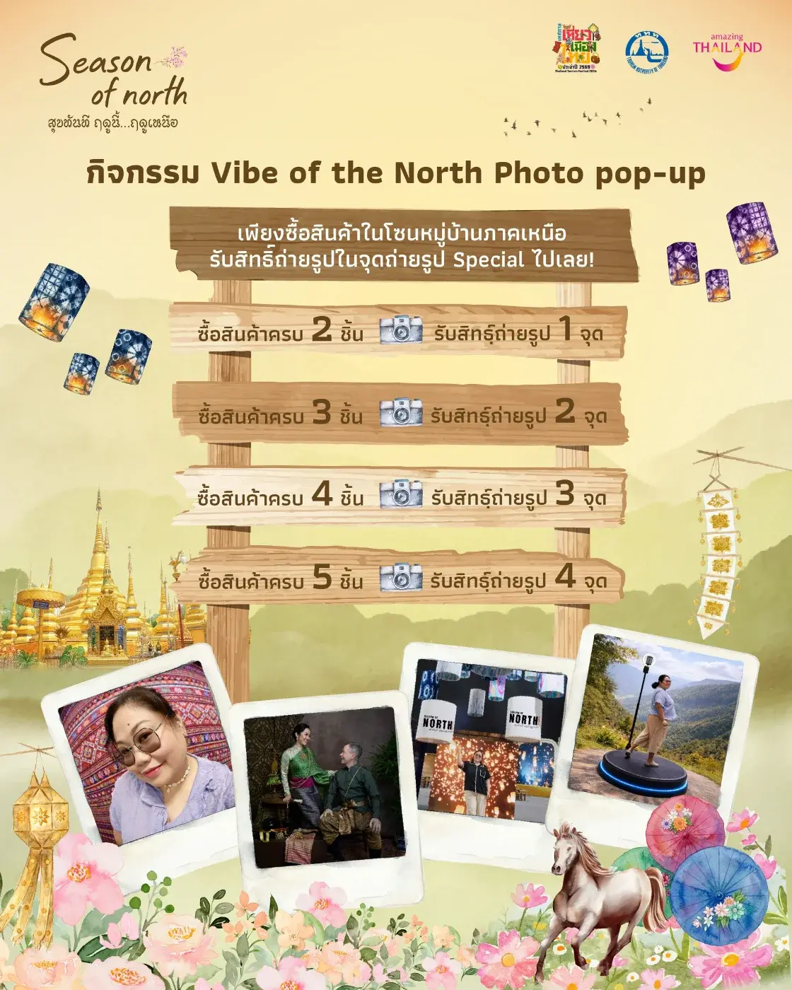 ปิดท้ายความประทับใจด้วยกิจกรรมส่งเสริมการใช้จ่ายที่จะเพิ่มสีสันและความตื่นเต้นให้กับผู้เข้าร่วมงาน กับกิจกรรม “ช้อปปั๊บ รับสิทธิ์ปุ๊บ” เพียงช้อปภายในโซนหมู่บ้านภาคเหนือก็สามารถลุ้นหมุนวงล้อรับของรางวัลสุดพิเศษ และกิจกรรม “Vibe of the North Photo Pop-up” ที่ยิ่งช้อป ยิ่งได้สิทธิ์ถ่ายภาพในมุมสุดเอ็กซ์คลูซีฟ เก็บโมเมนต์ความสุขสไตล์ภาคเหนือกลับไปแบบไม่ซ้ำใคร
