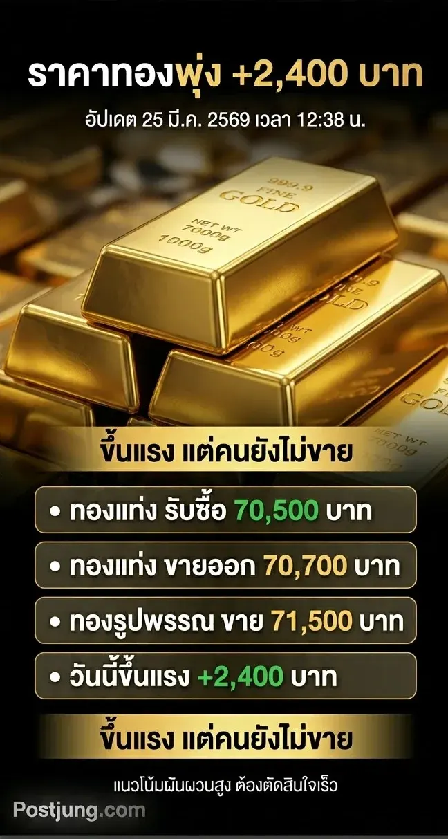 25 มีนาคม 2569 เวลา 12:38 น ราคาทองคำในประเทศพุ่งขึ้นแรง +2,400 บาท แต่คนไทยจำนวนมากยังไม่ขาย และเงินในกระเป๋ายังไม่เกิดขึ้นจริง