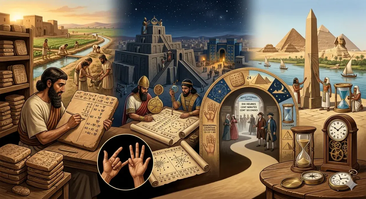เมื่อเวลาผ่านไป ความรู้จากหลายอารยธรรมค่อย ๆ ผสมผสานกัน แนวคิดของชาวอียิปต์ที่แบ่งวันออกเป็น 24 ชั่วโมง มารวมกับระบบเลขฐาน 60 ของชาวบาบิโลน จึงเกิดเป็นรูปแบบการแบ่งเวลาที่เราคุ้นเคย นั่นคือหนึ่งชั่วโมงแบ่งออกเป็น 60 นาที และหนึ่งนาทีแบ่งออกเป็น 60 วินาที