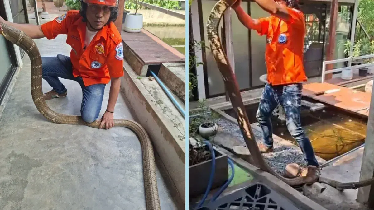 เมื่อทีมอสรพิษกู้ภัยรุดไปถึงที่เกิดเหตุ ถึงกับต้องตะลึงเมื่อพบว่างูตัวดังกล่าวคือ งูจงอางยักษ์ที่มีความยาวกว่า 5 เมตร กำลังขดตัวซุกซ่อนอยู่ภายในบริเวณบ้าน สร้างความหวาดกลัวให้กับผู้อยู่อาศัยและชาวบ้านที่มามุงดูเป็นอย่างมาก เจ้าหน้าที่ต้องใช้ทักษะและความระมัดระวังขั้นสูงสุดในการใช้อุปกรณ์เข้าควบคุมสถานการณ์ ท่ามกลางเสียงเชียร์และแรงใจจากชาวบ้านที่ลุ้นระทึกอยู่ห่างๆ