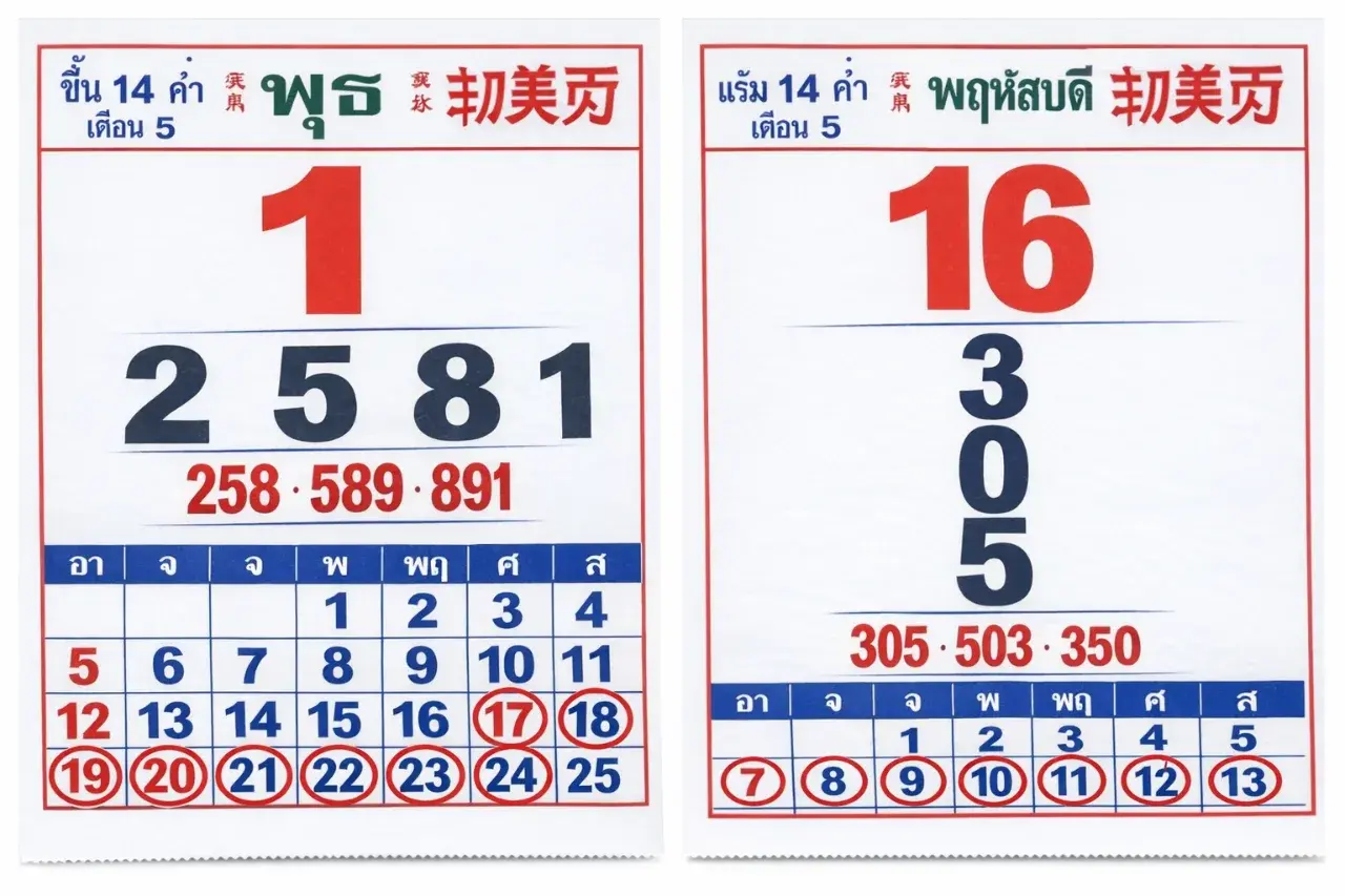 ขณะที่ งวดวันที่ 16 เมษายน 2569 ซึ่งตรงกับวันพฤหัสบดี แรม 14 ค่ำ เดือน 5 และยังอยู่ในช่วงเทศกาลสงกรานต์พอดี เมื่อลองสังเกตในช่องวันดังกล่าว จะพบว่ามีตัวเลข 3, 0 และ 5 ปรากฏอยู่ในลักษณะเรียงตัวกันอย่างเห็นได้ค่อนข้างชัด ทำให้หลายคนตีความออกมาเป็นชุดตัวเลขที่น่าสนใจ เช่น เลขสองตัว 30, 05, 35, 50 และ 03 ส่วนเลขสามตัวที่ถูกหยิบยกมาพูดถึง ได้แก่ 305, 503 และ 350