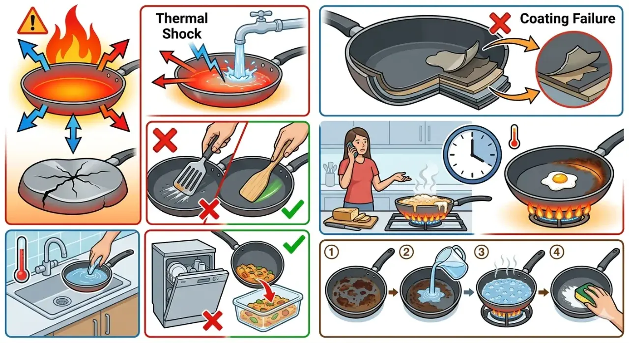 กระทะอาจเกิดการบิดงอ เสียรูปทรง และที่สำคัญที่สุดคือ “สารเคลือบผิว” ที่ช่วยป้องกันการติดกระทะจะเสื่อมสภาพเร็วกว่าปกติ บางครั้งอาจเริ่มลอกโดยที่เจ้าของบ้านยังไม่รู้ตัวด้วยซ้ำ