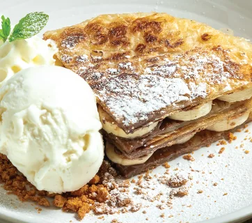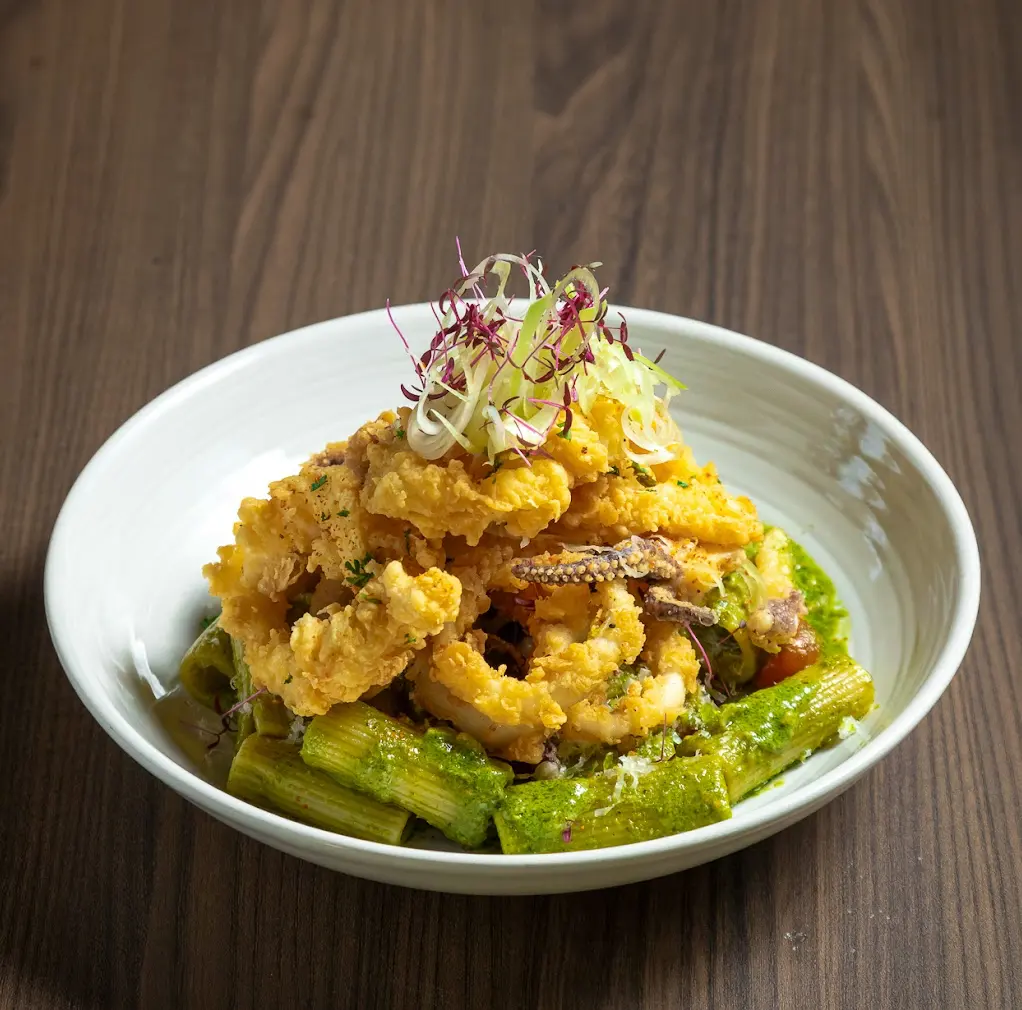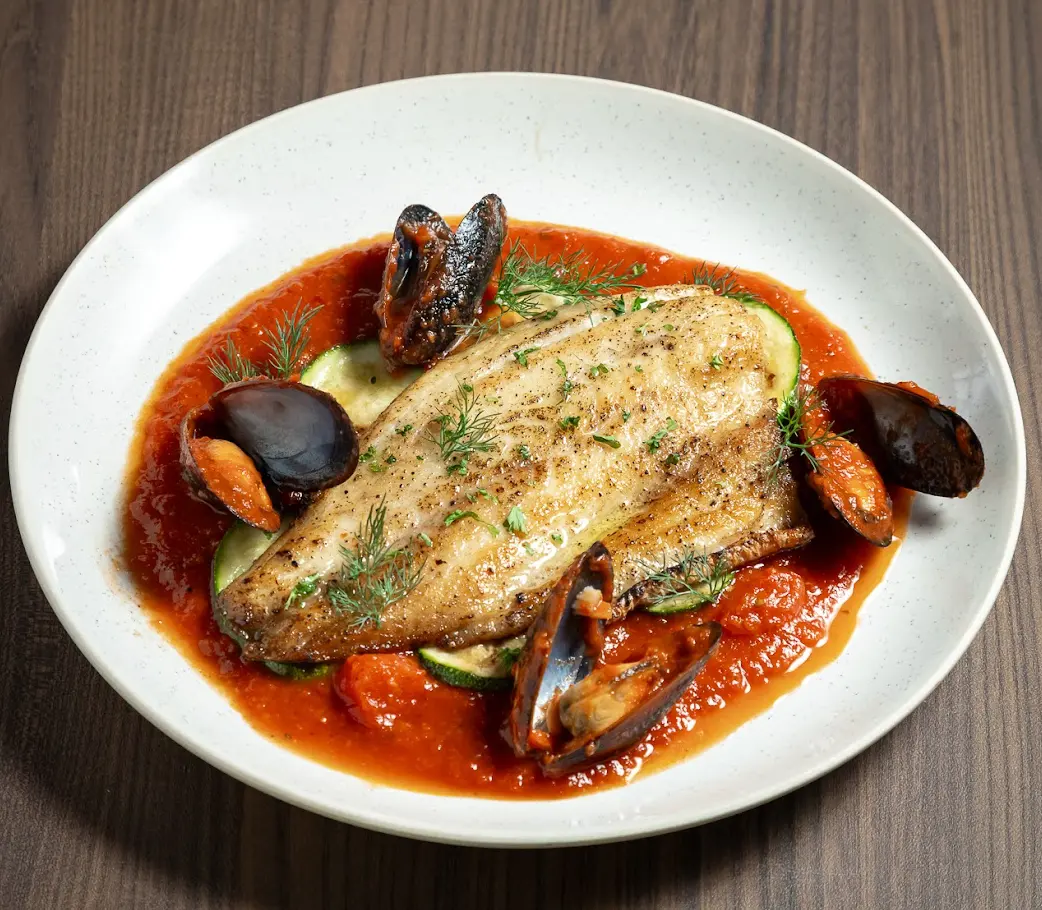 ปลากะพงอันดามันย่างจนหนังกรอบ เนื้อในนุ่มฉ่ำ มักเสิร์ฟคู่กับซอสหรือพาสต้า สะท้อนความเชี่ยวชาญด้านซีฟู้ดของร้านได้อย่างลงตัว