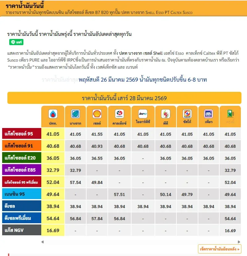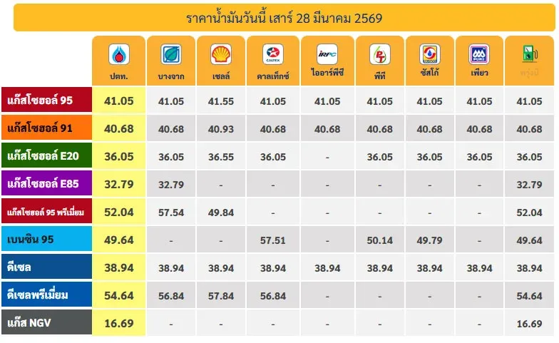 อัปเดตราคาหน้าปั๊มวันนี้ (28 มี.ค. 69)