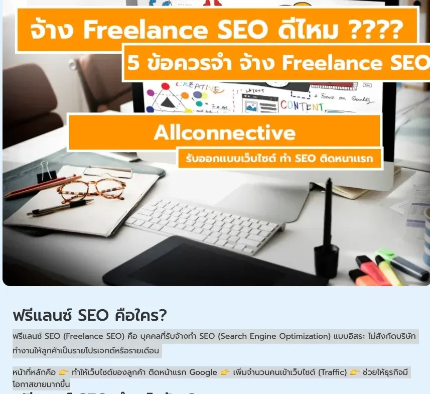 ฟรีแลนซ์ SEO (Freelance SEO) คือ บุคคลที่รับจ้างทำ SEO (Search Engine Optimization) แบบอิสระ ไม่สังกัดบริษัท ทำงานให้ลูกค้าเป็นรายโปรเจกต์หรือรายเดือน