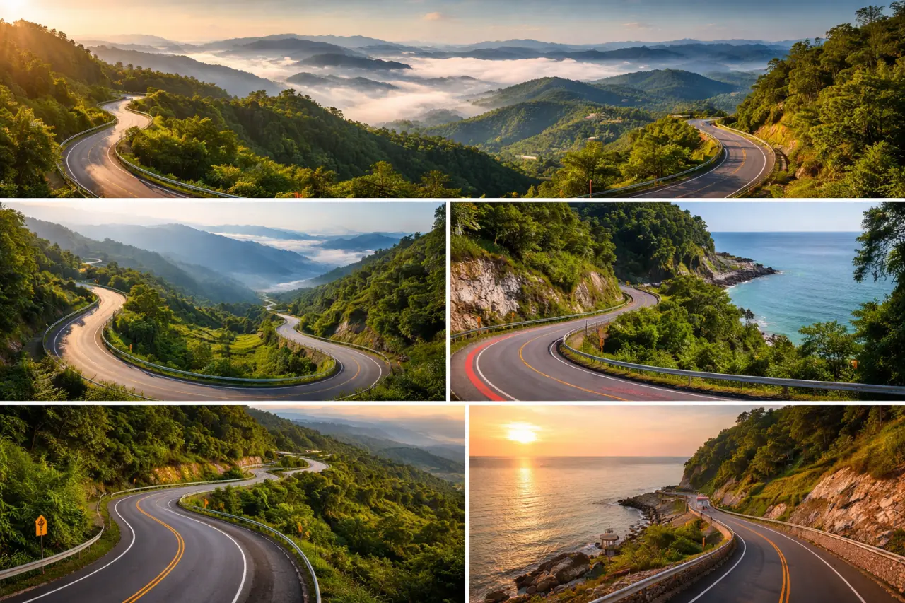 - จุดเด่น: โค้งเยอะที่สุดในไทย วิวภูเขาและป่า