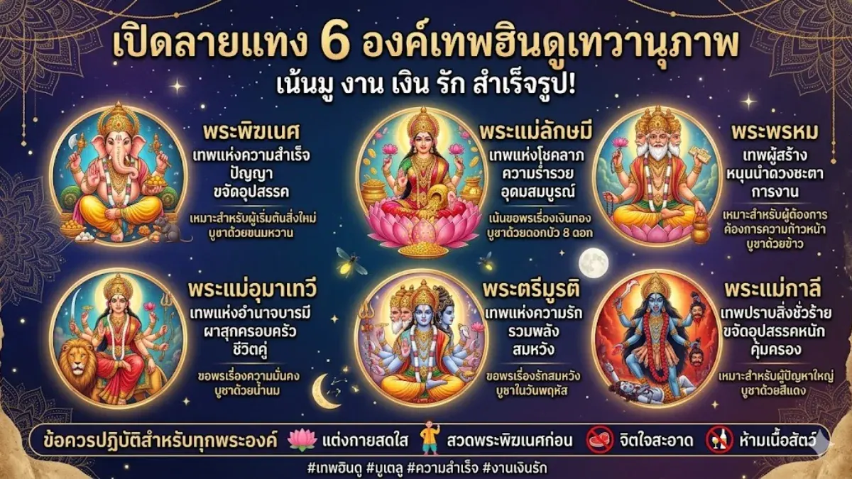 มูให้ปังด้วยพลังศรัทธา กับการเปิดลายแทง 6 องค์เทพฮินดูยอดฮิตที่สถิตอยู่ในใจสายมูชาวไทยมายาวนาน ซึ่งแต่ละองค์ท่านมีเทวานุภาพเกื้อหนุนในด้านที่แตกต่างกันไป ใครที่กำลังมองหาที่พึ่งทางใจเพื่อเสริมดวงชะตาให้รุ่งโรจน์ ทั้งเรื่องงาน เงิน รัก หรือความสำเร็จแบบครบวงจร ต้องไม่พลาดเคล็ดลับการบูชาที่ถูกต้องเพื่อรับพลังงานบวกอย่างสูงสุด