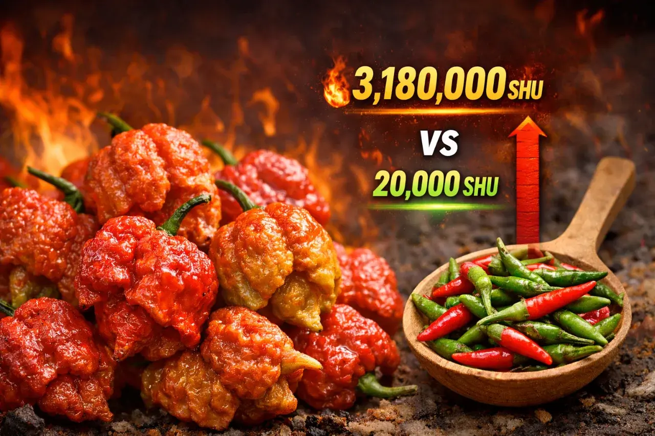แต่ Pepper X ได้ยกระดับความเผ็ดขึ้นไปอีกขั้นแบบ “เหนือขีดจำกัดมนุษย์” ด้วยค่าที่พุ่งแตะ 3.18 ล้าน SHU ซึ่งมากกว่าพริกขี้หนูที่คนไทยคุ้นเคย (ประมาณ 100,000–225,000 SHU) หลายเท่าตัว
