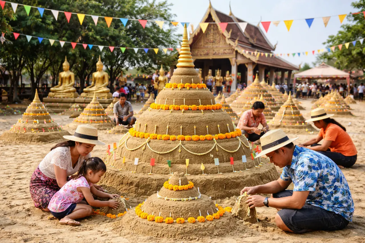 การก่อเจดีย์ทราย (มักทำช่วง สงกรานต์) นิยมประดับด้วยดอกไม้ที่ สีสวย ทนแดด และหาง่าย เพื่อความเป็นสิริมงคลและความสวยงามครับ