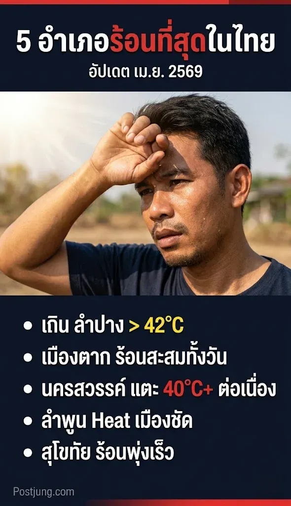 แต่ข้อมูลอัปเดตช่วงปลายมีนาคม–ต้นเมษายน 2569 กลับเล่าอีกมุมหนึ่ง — ยังมีหลายอำเภอที่ร้อน “พอกัน หรือหนักกว่า” โดยเฉพาะวันที่อุณหภูมิพุ่งเกิน 40°C แบบต่อเนื่อง