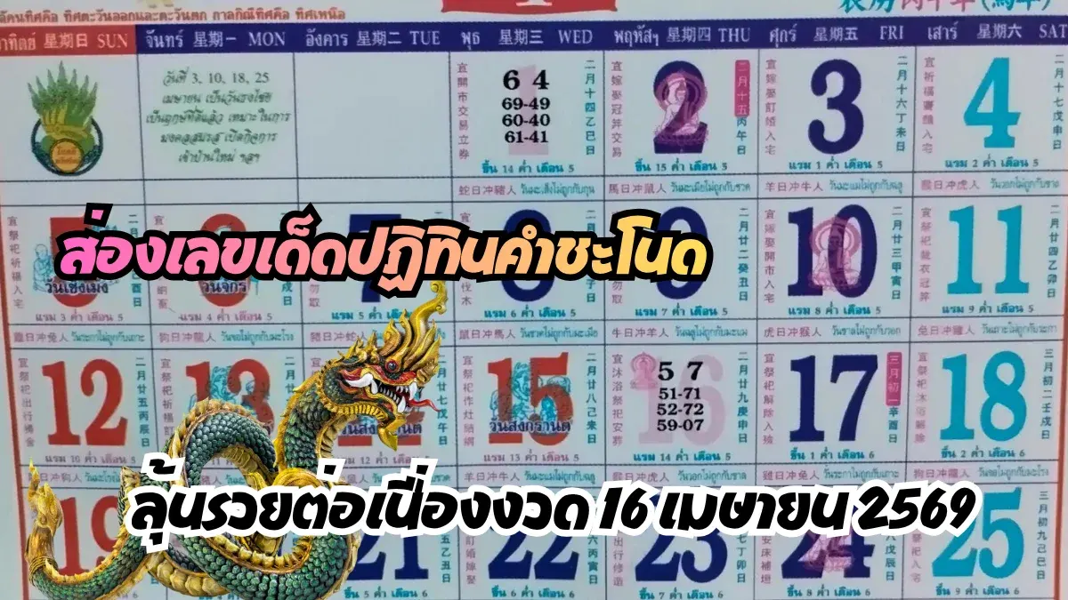 หลังจากสร้างปรากฏการณ์ "เข้าทางรวย" ด้วยเลขชุด 2 ตัวบนในงวดต้นเดือนเมษายนที่ผ่านมา ปฏิทินคำชะโนดฉบับปีมะเมีย 2569 ก็กลายเป็นลายแทงที่คอหวยทั่วประเทศต้องมีไว้ในมือ สำหรับงวดประจำวันที่ 16 เมษายน 2569 ซึ่งตรงกับช่วงเทศกาลสงกรานต์พอดี มีชุดตัวเลขที่น่าสนใจและควรค่าแก่การพิจารณาดังนี้: