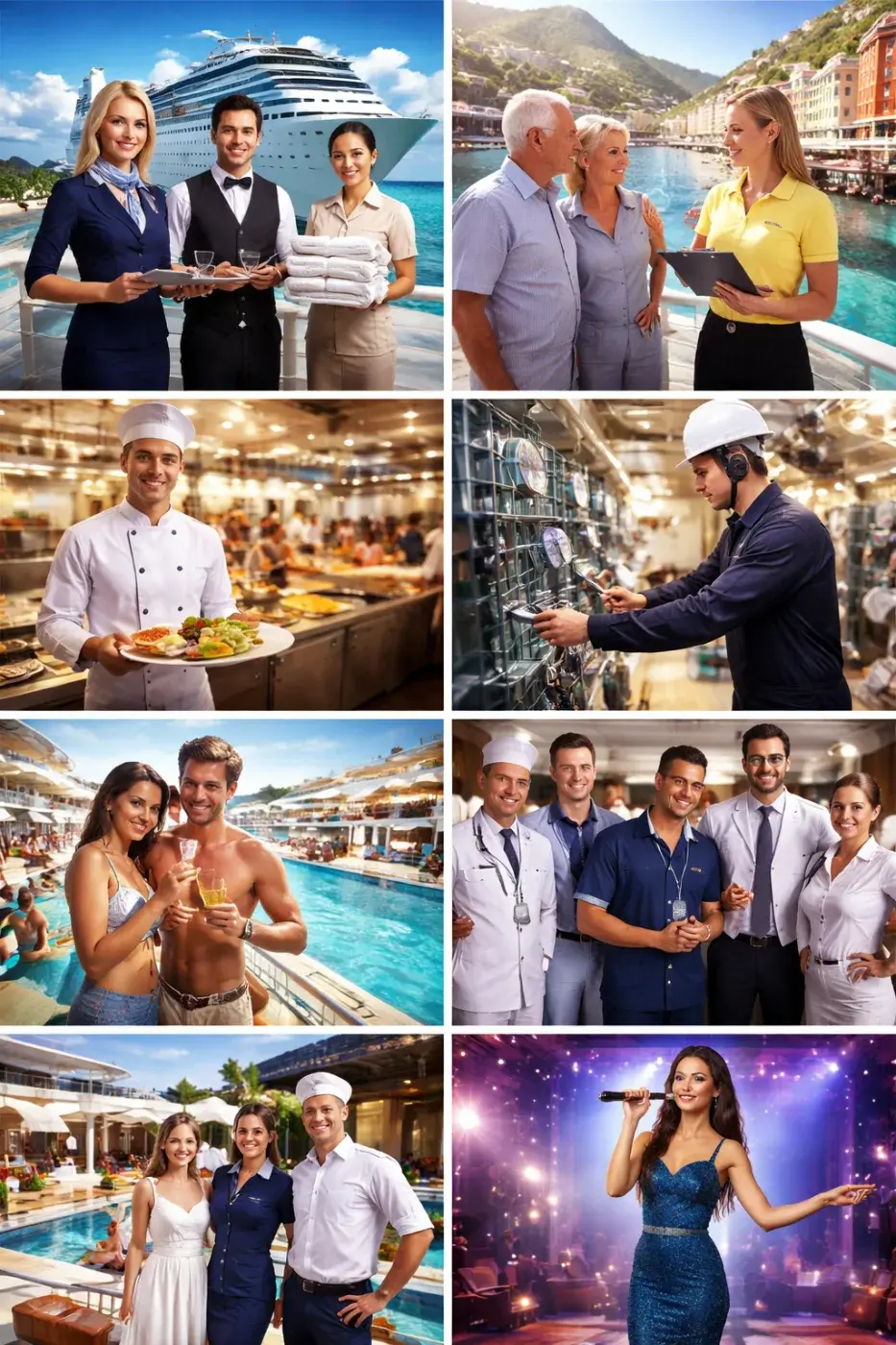 เรือสำราญขนาดใหญ่ในปัจจุบัน เปรียบเสมือน “เมืองลอยน้ำ” ที่มีสิ่งอำนวยความสะดวกครบครัน ไม่ว่าจะเป็นโรงแรม ร้านอาหาร โรงละคร สระว่ายน้ำ ร้านค้า ไปจนถึงโรงพยาบาลขนาดย่อม จึงทำให้ต้องมีพนักงานจำนวนมากจากหลากหลายสาขาอาชีพเข้ามาร่วมทำงาน ตั้งแต่งานบริการ งานบันเทิง งานเทคนิค ไปจนถึงตำแหน่งบริหารระดับสูง
