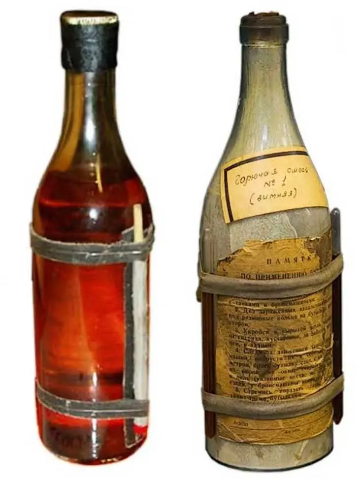 * นวัตกรรมแอมพูลเคมี: โซเวียตติดหลอดแก้วบรรจุกรดซัลฟิวริกไว้ข้างขวด เมื่อขวดแตกสารเคมีจะทำปฏิกิริยากันและเกิดไฟลุกท่วมทันที ลดโอกาสที่ไฟจะดับเพราะลมหรือฝน