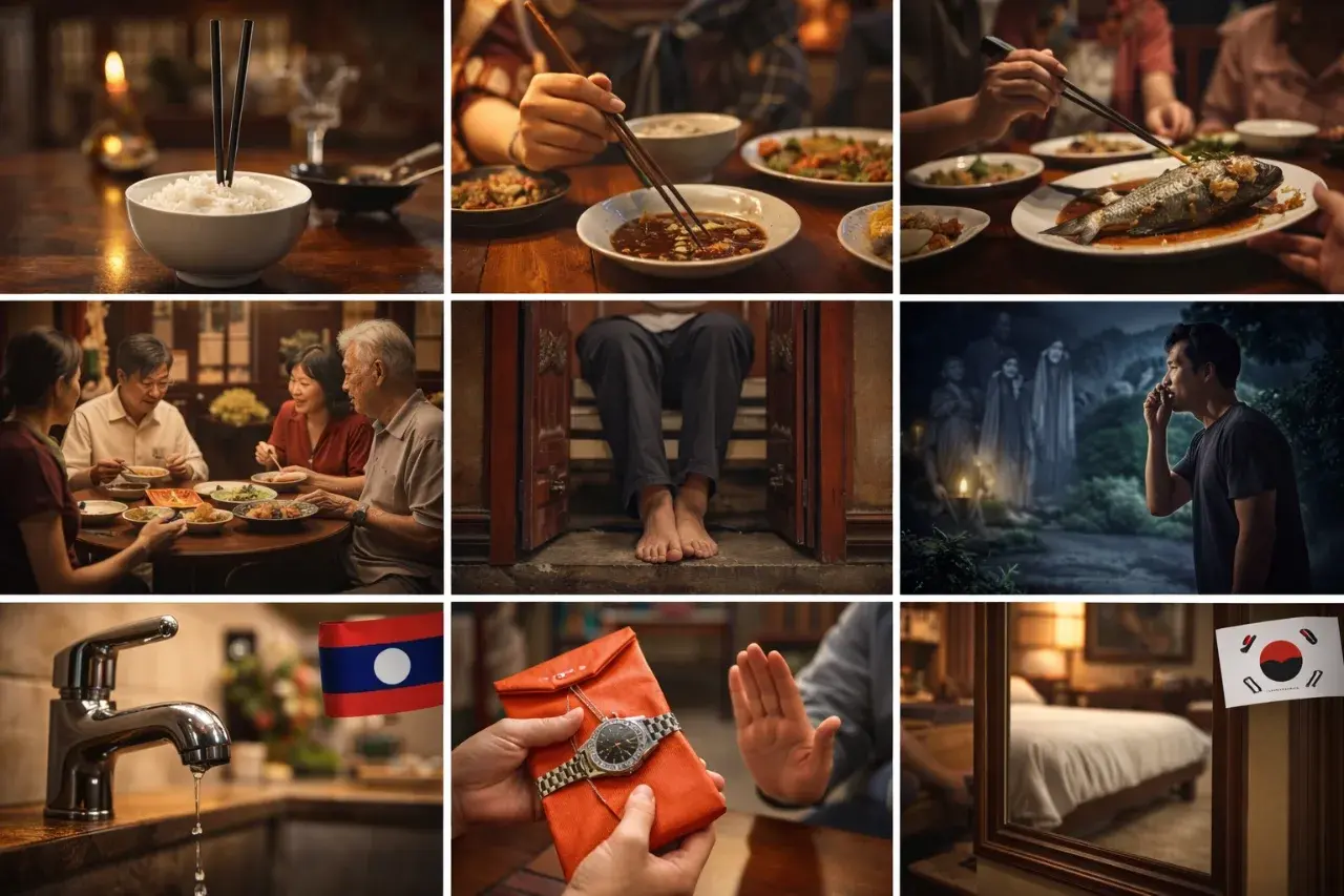 เรื่องแรกที่ถือเป็นเรื่องใหญ่ที่สุดคือบนโต๊ะอาหารครับ ห้ามเด็ดขาดคือการปักตะเกียบไว้กลางชามข้าว เพราะมันดูเหมือนการปักธูปไหว้ศพ ซึ่งถือเป็นลางร้ายอย่างมาก รวมถึงการใช้ตะเกียบเคาะถ้วยชามก็ไม่ได้ครับ เพราะคนโบราณเชื่อว่าเป็นการเรียกขอทานหรือวิญญาณเร่ร่อนให้มากินข้าวด้วย