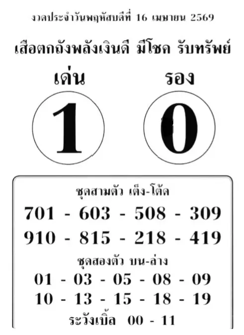 เลขเด็ด เสือตกถังพลังเงินดี มีโชค รับทรัพย์ งวดวันที่ 16/04/69 นี้ก็ได้ปล่อยทั้งเลขเด่น เลขดัง มาให้บรรดาคอหวยได้ไปพิจารณากัน สำหรับใช้เป็นแนวทางในการเสี่ยงโชคซื้อลอตเตอรี่ โดยงวดนี้มีเลขเด่น คือ 1 และรอง คือ 0 ส่วนตัวเลขในชุดอื่น ๆ ก็มีความน่าสนใจเป็นอย่างมาก สามารถไปดูที่ใบหวยด้านล่างกระทู้กันได้เลย