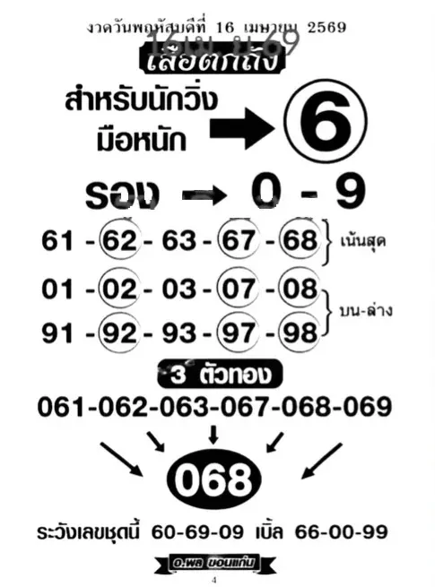 เลขเด็ด เสือตกถัง สูตร "อ.พล ขอนแก่น" งวดวันที่ 16/04/69 นี้ก็ได้ปล่อยทั้งเลขเด่น เลขดัง มาให้บรรดาคอหวยได้ไปพิจารณากัน สำหรับใช้เป็นแนวทางในการเสี่ยงโชคซื้อลอตเตอรี่ โดยงวดนี้มีเลขเด่น คือ 6 และรอง คือ 0 - 9 ส่วนตัวเลขในชุดอื่น ๆ ก็มีความน่าสนใจเป็นอย่างมาก สามารถไปดูที่ใบหวยด้านล่างกระทู้กันได้เลย