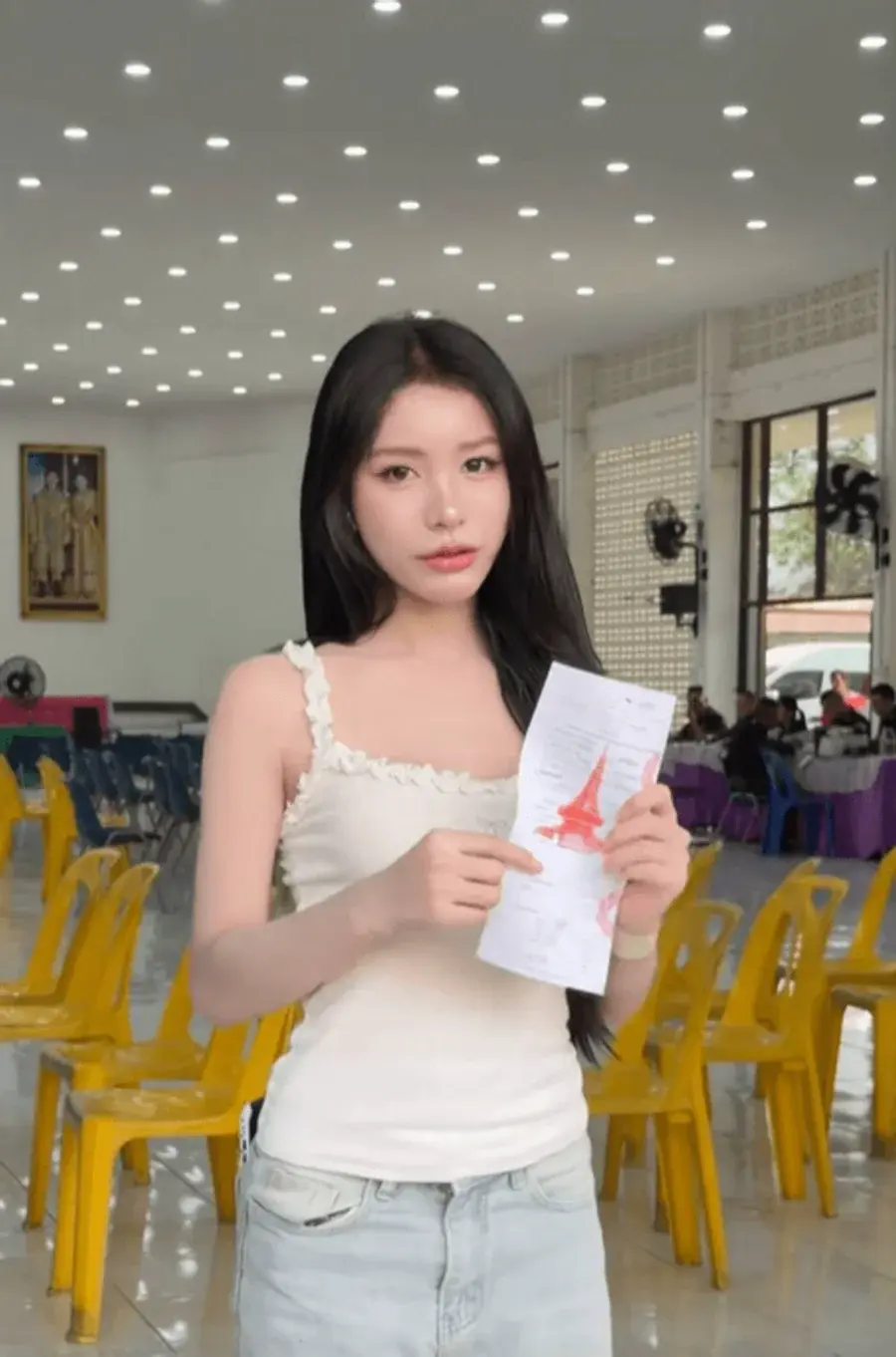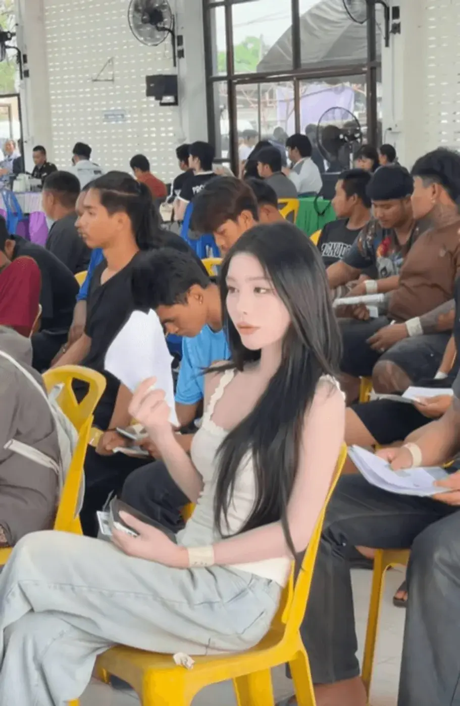 บรรยากาศของการคัดเลือกทหารกองเกินในปี 2569 เริ่มต้นขึ้นอย่างมีชีวิตชีวา แต่สิ่งที่กลายเป็นจุดสนใจหลักของผู้ที่มารอจับใบดำใบแดงนั้นก็คือการปรากฏตัวของ “ดรีมโน๊ะ” อินฟลูเอนเซอร์สาวประเภทสองที่มาทำหน้าที่รายงานตัวตามกำหนดการ ดรีมโน๊ะได้ปรากฏตัวในชุดเสื้อสายเดี่ยวสีขาวที่แมตช์กับกางเกงยีนส์ พร้อมกับปล่อยผมยาวสลวยสวยงาม แม้จะเป็นลุคที่ดูสบาย ๆ แต่ความสวยและออร่าของเธอกลับโดดเด่นอย่างชัดเจนท่ามกลางชายไทยนับร้อยที่มารอจับใบชี้ชะตาชีวิตในอีก 2 ปีข้างหน้า